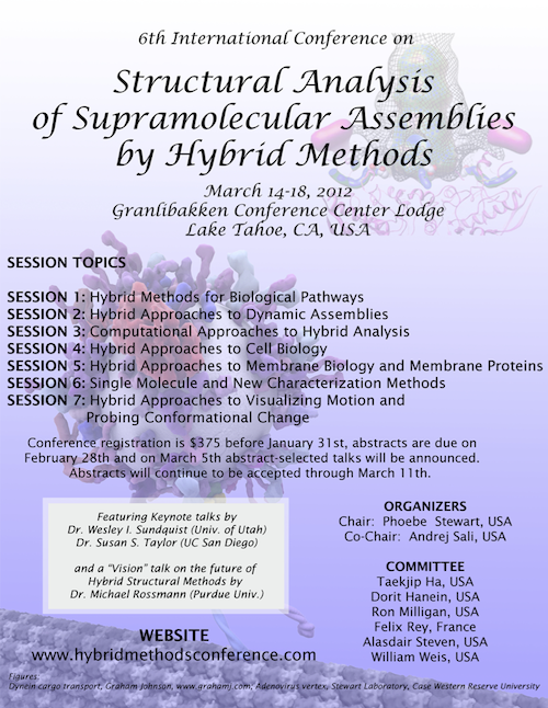 The 6th International Conference on Structural Analysis of Supramolecular Assemblies by Hybrid Methods will be held March 14-18, 2012 in Lake Tahoe, CA.